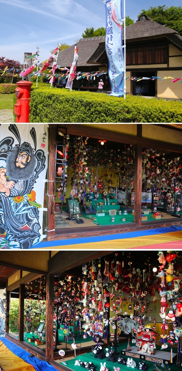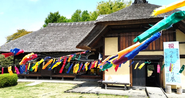 【端午の節句つるし飾り】 ゴールデンウィーク中、曲がり屋の屋内に、手作りのこいのぼりなど、数多くの飾りがつるされて展示されています。庭には地域の小学生が作ったと思われるこいのぼりがたくさん泳いでいます。 つるし飾りが見られるのは年2回。桃の節句と端午の節句の時だけですので、ちょっと寄り道して見学してみてはいかがでしょうか。