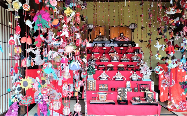 【那珂のひなまつり】 3月3日まで、曲がり屋の中に雛人形とともに、つるし雛がたくさん飾られています。 見ごたえがあります。 1本の紐に、いろいろな飾りが付けられ、その飾りもそれぞれ意味があるようです。 今年は辰年で、辰(竜)は「富」と「権力」の象徴とされる縁起のよい架空の生き物だそうです。 5月には、つるし飾りが見られるので、見に行きたいです。
