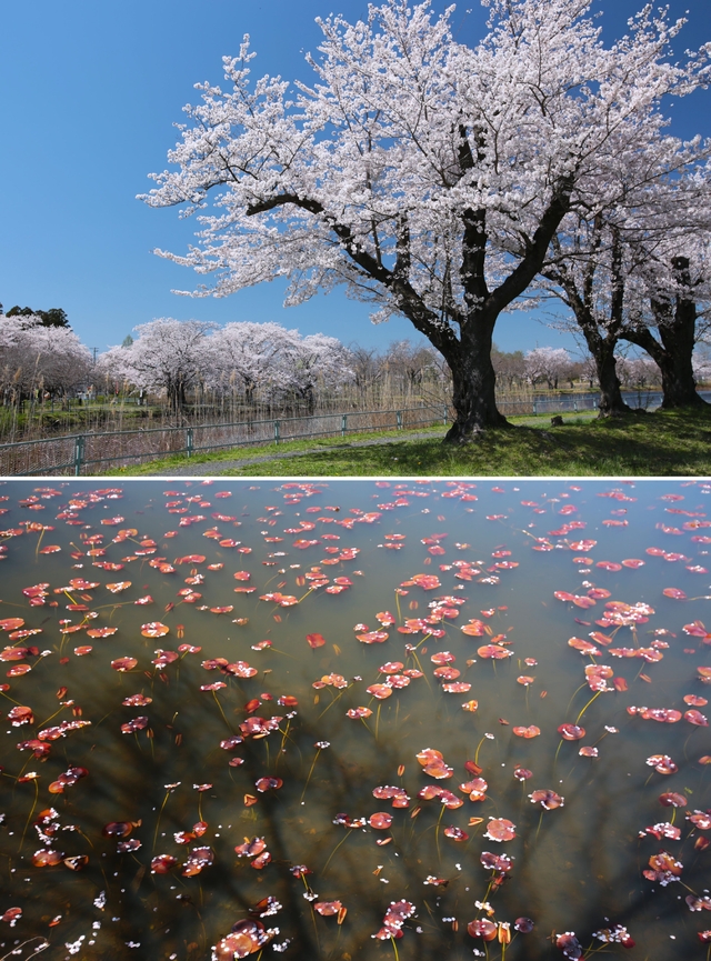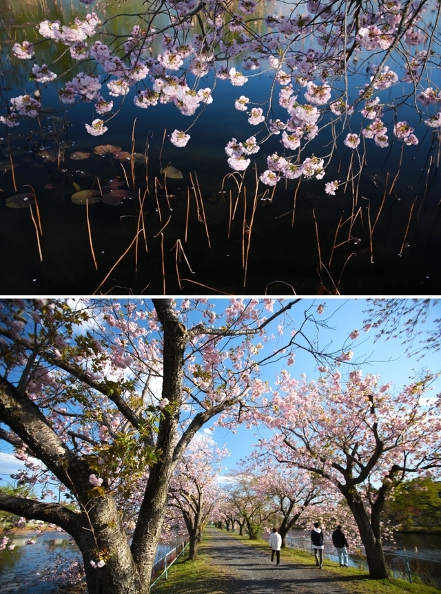 二つの池の間にソメイヨシノと八重桜の並木があります。穏やかな日は散歩をする方や釣りを楽しむ方がいて、まったりと時が過ぎていく感じです。 今年は桜の散るのも早くて、八重桜が睡蓮や蓮の生い茂る水面に花びらを散らしてしまいました。