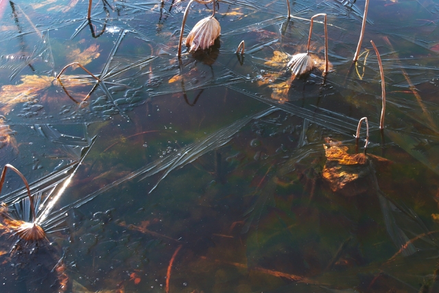 昼間は暖かいですが、朝夕は空気が冷たく冷え込みも厳しくなってきました。 宮の池も日陰は薄氷が張り、枯れた蓮を覆っています。氷の造形が面白いですね。
