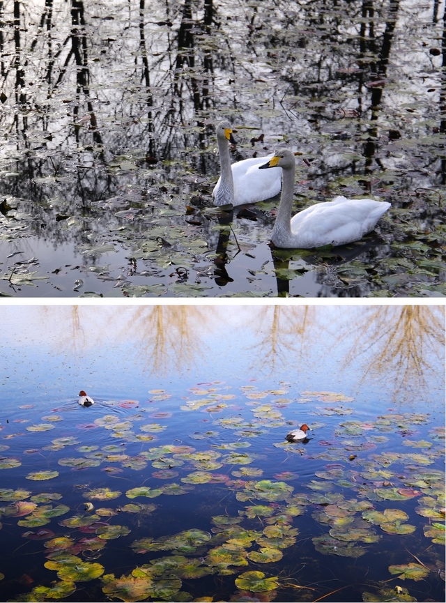 睡蓮の紅葉が気になったので行ってきました。夏の暑さのためか、昨年より色づきが悪いです。 白鳥が2羽優雅に羽を休めていました。水鳥も沢山います。