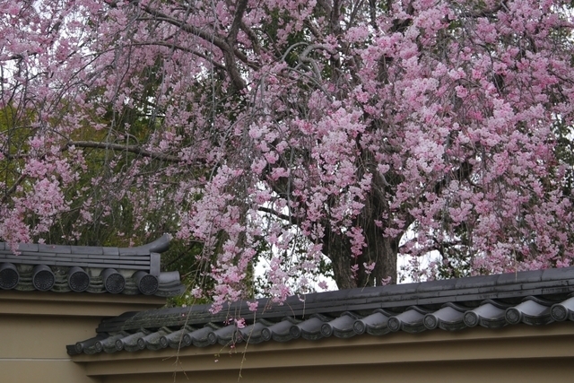 「宮の池」の桜は散り始めていました。白鳥が2羽優雅に泳いでいました。 近くにある樹齢600年の立派なカヤの木で有名な、「不動院」の山門に覆いかぶさるように咲く枝垂れ桜が満開でした。