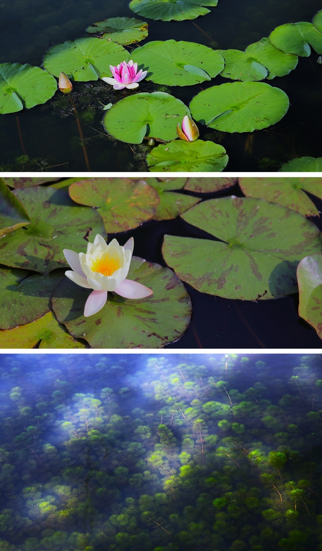 睡蓮が咲き出しました。白が多いのですが、赤も少しだけあります。また、水中の金魚藻?が光に照らされて綺麗でした。