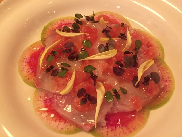 とても上質なワインバーです。お料理は丁寧に盛られていて、何を頂いても美味しかったです。お料理が出てくるタイミングが良くて、一皿一皿、目で口で味わうことができました。 写真は鯛のカルパッチョ。鮮やかな一皿でした。 キャロットラペも美味しくて、自分なりに検索して家でも作ってみました。オシャレなメニューを自宅で日常的に作るお手本にできたらたまの贅沢もいいかな!と思います。料金設定はお高めですが、満足です。 ランチも行ってみたいですが、できればまた夜に行きたいです。