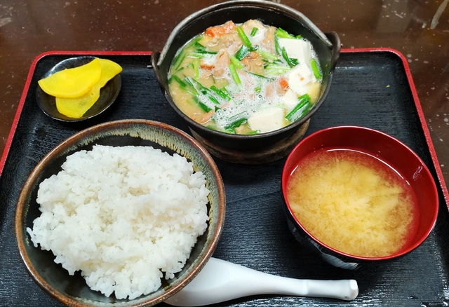 【もつ鍋定食】 今回は、名物のもつ鍋定食をいただきました。もつ鍋の中には、大ぶりのもつがたっぷり。ニラ、豆腐、にんじんも入っていました。もつは柔らかく、濃いめの味噌味で煮込んであるので、ごはんのおかずにピッタリで、おいしくいただきました。(880円)