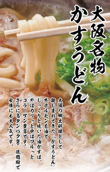 当店の看板メニューの『大阪名物かすうどん』は油で揚げた牛ホルモンがのったうどんは絶品♪