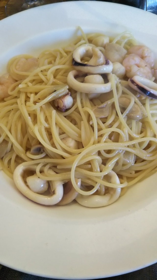 いつも海賊スパゲティやトマトソースのパスタなので今回は塩味にしてみました。 海の幸スパゲティ塩味です。 エビ、タコ、イカ、小柱、玉ねぎ、マッシュルームと具沢山で美味しかったです。