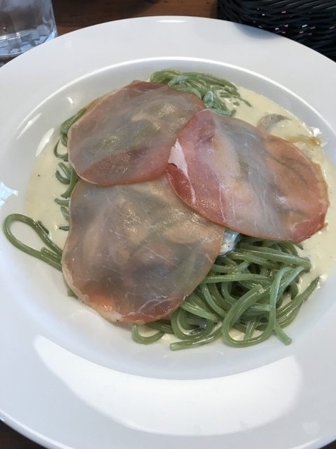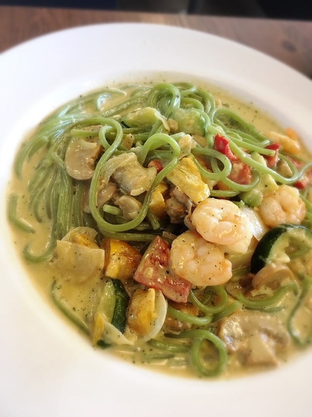 バジル味のスパを食べたくてグルービーへ行く。 クリームタイプのソースはまったり濃厚で美味しかった。生パスタも初めて食べたが、もちもちして美味しかった。 野菜のパプリカ、ズッキーニなどの野菜がたくさん入っているが、ちょっと煮込み過ぎかな。野菜のシャキシャキ感がある方良いと思う。
