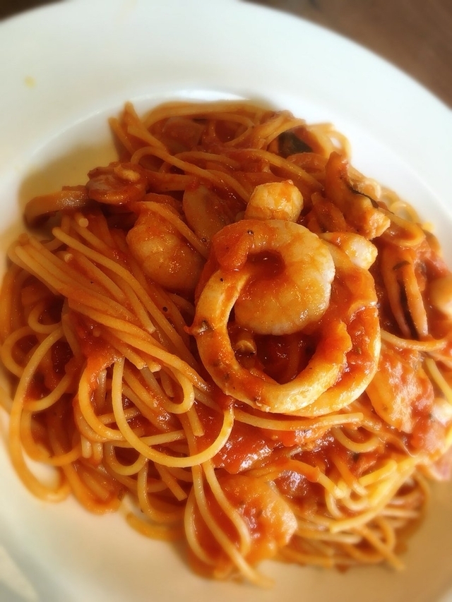 トマトソース味「海の幸」1134円 甘みのあるトマトベースがよくスパにからんで美味しかった。 具も意外にたくさんはいっています。 スパに必ずついてくるサラダは、具沢山でお得。 本日はニンジンドレッシングがたくさんかかっていました。 リクエストが2つ。 1つは和風デザートを増やして欲しい。 2つは、入り口のドアが異常に重すぎる! 絶対直すべき。子供やお年寄りにあのドアを開けるのは困難です。