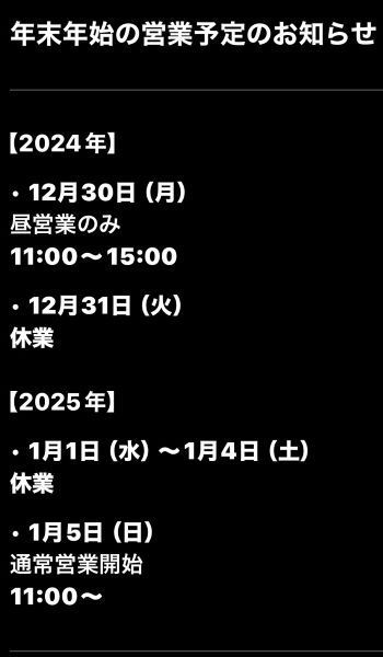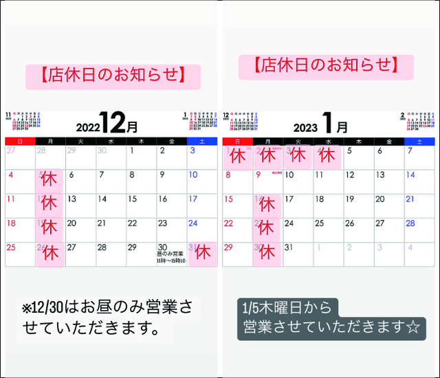 年内の最終営業は12月30日昼15:00まで、年始は1月5日より営業を再開いたします。