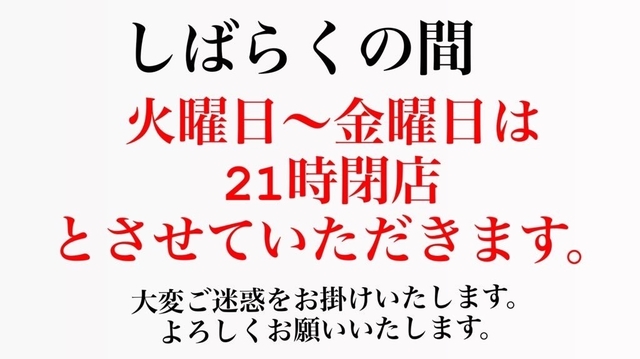 しばらくの間火曜日~金曜日は、21時閉店とさせていただきます。