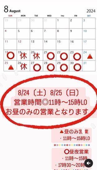 8/24(土)8/25(日)の営業時間は、お昼のみのとなります。