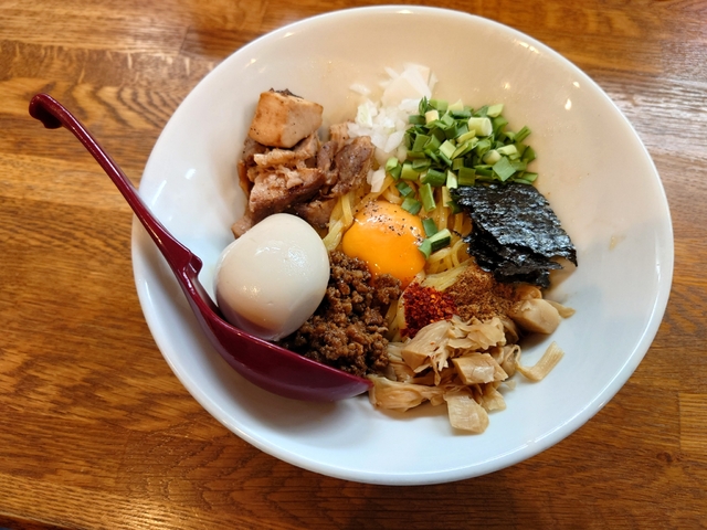 初訪問です。 ネットで調べると店舗の隣接に5台、すぐ南にも7台あるそうで。 つくばの福来みかんを扱った期間限定メニューの福来台湾まぜそばを食べました。 トッピングがいろいろたっぷり。 麺の食感がいい。 辛みの中にふっと香る柑橘もいいです。 口直しのスープをいただきなから、最後は追い飯で完食です。 おいしかった。
