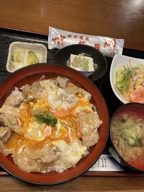 ランチに親子丼をいただきました!炭火焼なのでとても香ばしく、ボリュームもあってお腹いっぱいです!味噌汁や小鉢などサービスがすごい!