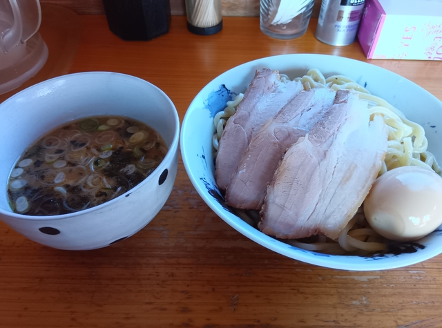 久しぶりに入店。 こちらも値上げしてました。最近の物価高では仕方ありません。 自分は900円のつけ麺、嫁さんはサンマー麺を。 サンマー麺はもやしたっぷりのあんかけ、麺が細いのでのびやすいのが残念。 つけ麺はチャーシュー三枚乗ってボリュームあります。 スープ割りできるといいのにな。