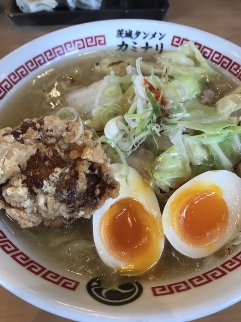 ボリュムもあって美味しかったです。写真は茨城タンメン、味玉・唐揚げトッピング。唐揚げも餃子も大きくて食べ応えがあります。麺は細麺で、スープはにんにくがきいて美味しいです。