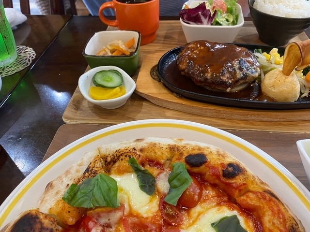 ランチにハンバーグセットをいただきました。 ピザマルゲリータもセットにするとサラダとドリンクで おなかいっぱい満足です!