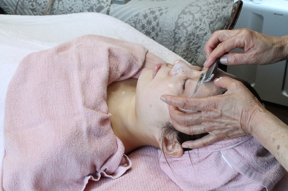 心地よいスチームの蒸気に癒されながら、 女性スタッフによる丁寧な クレンジング→マッサージ→蒸しタオル と、施術を受けます。 一度、施術を受けたらやみつき! 女性スタッフの手はゴットハンド!!
