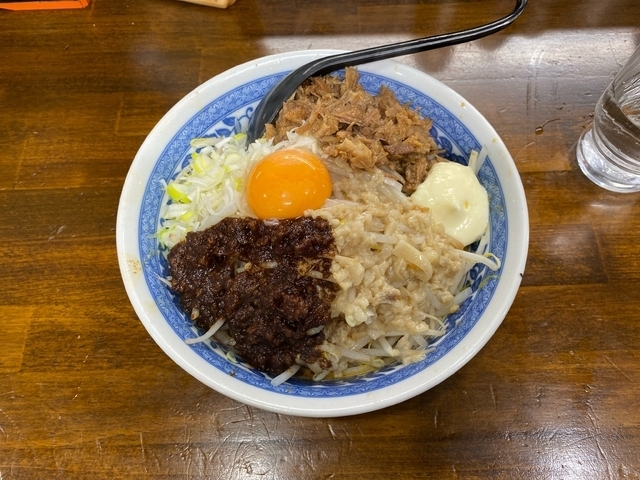 お昼に、「まぜそば」をいただきました。 ほぐしたチャーシューや、もやしなど具材たっぷりで普通の人なら並盛りでお腹いっぱいになります。 …辣油の辛さが効いて食が進みます。結構辛いです。。。でも安心してください、注文時に辛いの大丈夫かどうか聞かれるので調整できます♪