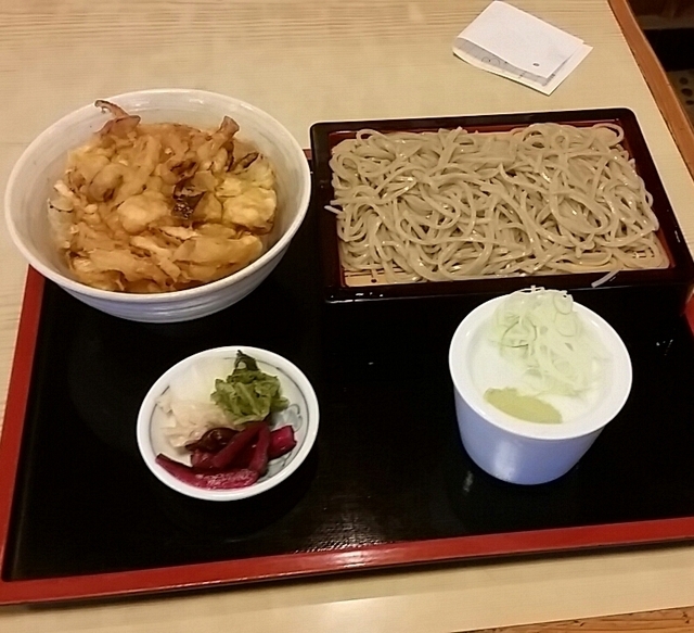 ◆海鮮かき揚げ丼セット1,000円 そばは、日光のそば粉を使用。 細麺のやわらかめ。 ツルッとしたタイプ。 つけ汁は、鰹、鯖、 ソウダガツオの3種から出汁を とっているらしい。 かき揚げは、海老、いか、 野菜の分厚く、 たれは薄めの丼。