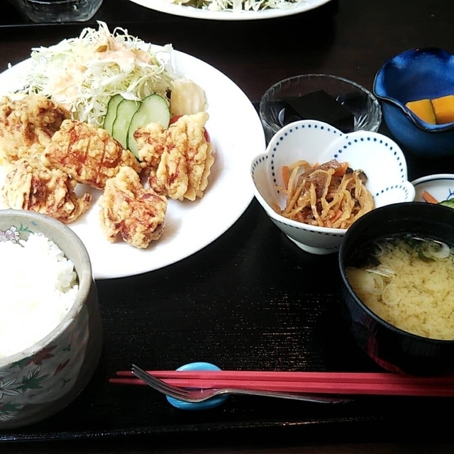若鶏唐揚げ定食を注文です♪ 柔らか〜い鶏唐揚げはなかなかジューシーです。 切干し大根、カボチャの荷物、漬物、コーヒーゼリー、味噌汁、アイスコーヒーが付いて満足の定食です