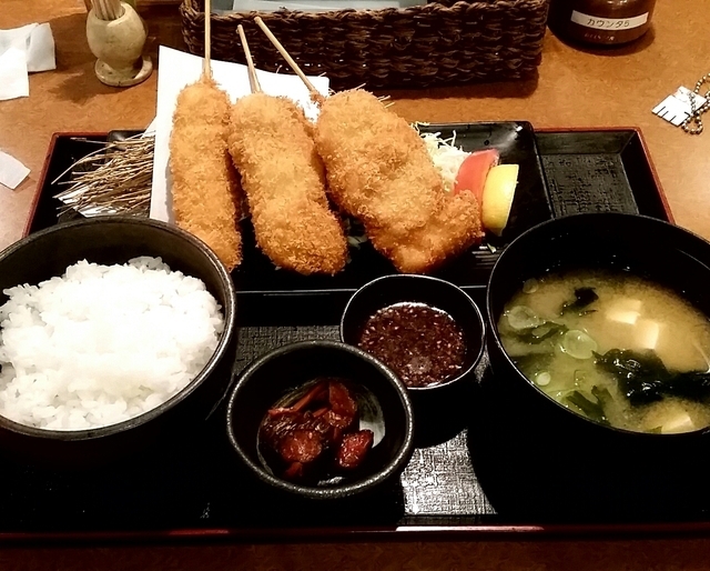 県庁に来たので、 近くの居酒屋でランチ。 メニューが豊富です。 ◆二種の串カツ定食700円 豚バラ玉ねぎとささみの串カツ。 ボリューム満点で、 味も良いのでお昼には最適です。