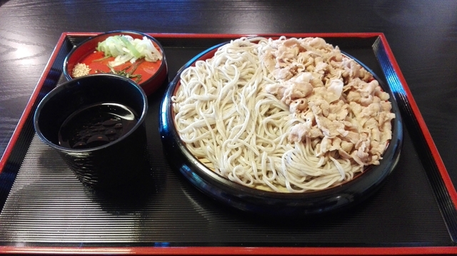 以前は「腕打ち蕎麦やなぎ」だったところですが、店変わりしたのですかね?昼に初訪問し、豚つけそば(肉増し)をいただきました。細麺のもりそば上に湯引きないし茹でたような豚バラ肉がどっさり載っていて、普通の蕎麦屋では全く見馴れない光景でした。薬味皿には刻み海苔に刻みネギと胡麻が配されていますが、山葵は無し。しかしつけ汁表面に油が浮いているのが認められ、味わうとピリ辛の辣油。これが山葵に代わる刺激なのかな?と、ちょっとした驚きです。冷やしなのでつけ汁の中で豚脂が固まり、舌触りが若干ざらざらしたりする点は好悪分かれるところかも知れませんが、結構美味しくいただけました。肉としては鶏肉や牛肉もあるようなので、ちょっと食べ比べてみたいかなと思いました。