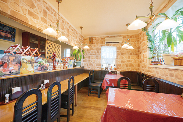 黄色の外観が目印!暖かな光が差し込む店内は明るい南欧のイメージ。