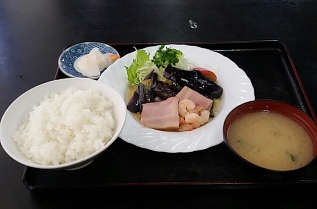 ◆日替わり定食770円税込 ナスベーコン生姜焼き 市場の中にあり、 そこで働く方たちのための食堂。 一般の方でも食事可能。 朝早くから営業しているので、 朝食にも利用できます。