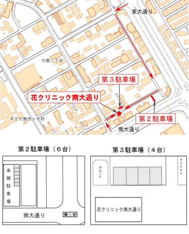第1駐車場:クリニック敷地内に7台の駐車が可能です。 第2駐車場:クリニックから40m程のところにあり、6台の駐車が可能です。 第3駐車場:クリニックの向かい側に4台の駐車が可能です。