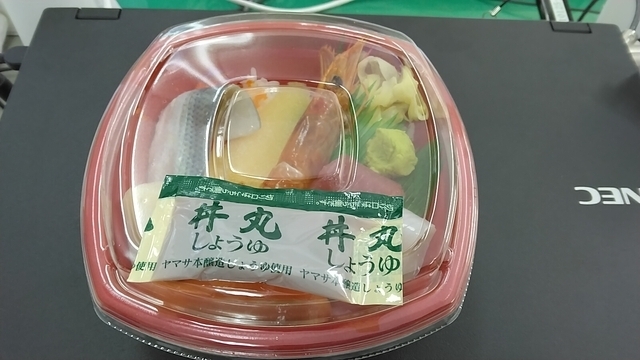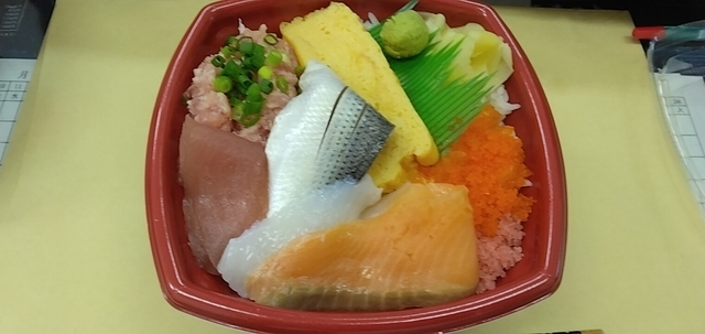 転勤し職場が古河市内になったので、久々の訪問。 海鮮丼をテイクアウト。 エビやコハダ、イカ、ハマチ、サーモンなどがのっていてお得です。 わさびが辛めなので、付けすぎ注意です。 ごちそうさまでした。