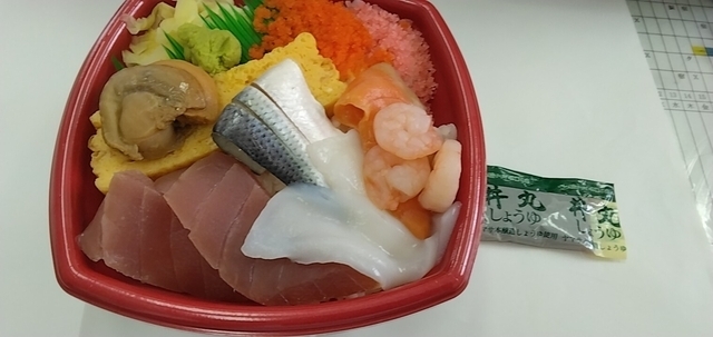 今回はちらしをテイクアウト。 ネタは、イカ、マグロ、サーモン、たまご、トビッコ、エビ、ホタテ。 これで540円とコスパ抜群。 おいしくいただきました。