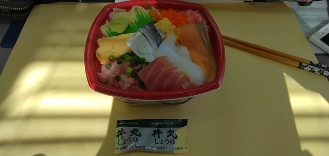 この日は丼丸さんでテイクアウト。 どんまる丼をオーダー。 ネタは、マグロ、サーモン、ネギトロ、イカ。 美味しくいただきました。ごちそうさまでした。