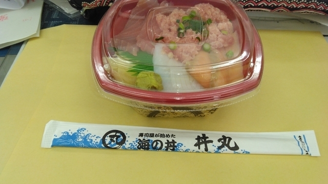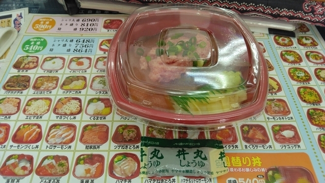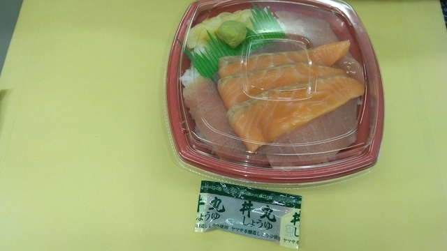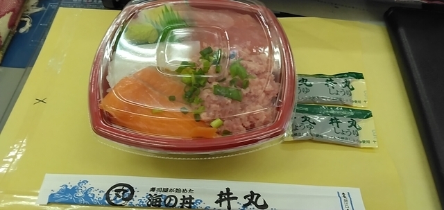 どんまる丼をテイクアウト。 気がつきませんでしたが、ふと迷ったらわたしはどんまる丼をオーダーしているようです(^_^;) ネタはマグロ、ネギトロ、サーモン、イカ。 ごちそうさまでした。
