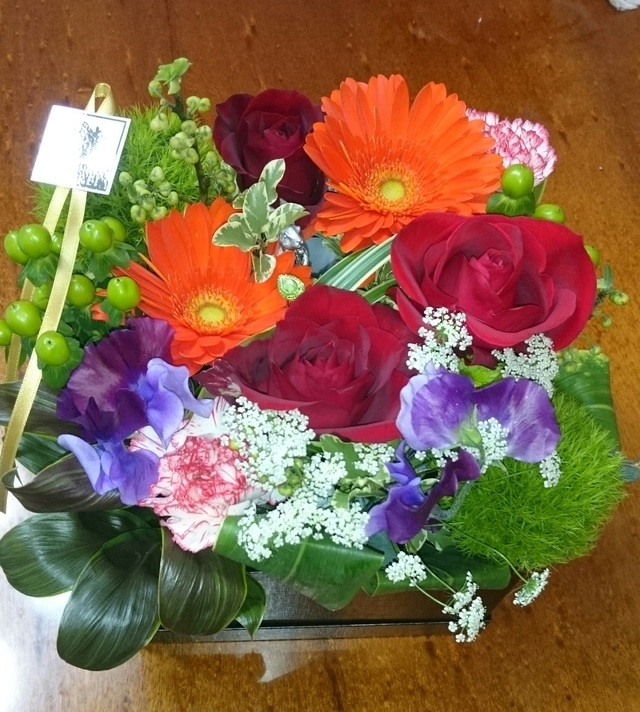 自動車の納車の際,販売店からセレモニーで渡されたのがこちらのboxアレンジでした。車とお花,ダブルで嬉しかったです。