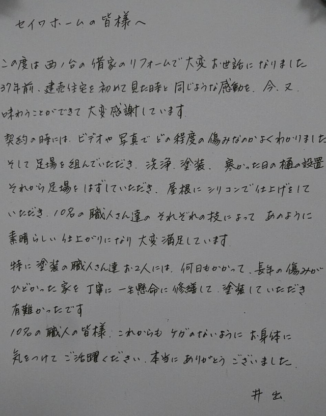 見積り時に丁寧な説明があり、外壁塗装をお願いしました。職人さんも気持ちよく対応してくださり、安心してお任せできました。完成に満足しています。ありがとうございました。