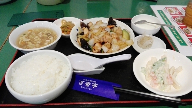 久しぶりに平日夜に再訪すると、外国人留学生の小パーティ(?)でかなり賑わっています。出されたジャスミン冷茶を飲みながら、平日夜限定の定食メニューからエビと玉子のチリソース定食を注文しました。主菜は炒めたエビ・玉子にチリソースをかけ、グリーンピースとレタスを添えたもので、甘辛く美味。ミニサラダは水菜とニンジンのみ、漬物は大根とニンジンの甘醤油漬、デザートは杏仁豆腐。ランチ同様に白飯はお替り自由で、刻み青菜とナメコの入ったかき玉豆腐中華スープも付きます。白飯お替りで満腹となりました。なおこれまでやっていたスタンプカードは今月初めに終了したとのことで、集めたスタンプで割引してもらいました。