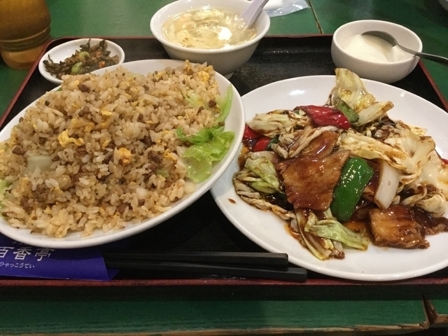 こちらも筑波大近くのため学生客でいつも賑わっています。久しぶりに昼に再訪し、出されたジャスミン冷茶を飲みながら、ランチメニューの青椒牛肉絲定食とクーポンのタピオカミルクティー(珍珠奶茶)を注文しました。牛肉細切り・ピーマン・赤パプリカ・シナチクから成る青椒牛肉絲は意外に量が多く、熱々で美味。小菜としてマカロニサラダ、点心として焼売1個、漬物としてシナチクのピリ辛甘醤油煮、デザートとして杏仁豆腐も付いており、お得感があります。また白飯はお替り自由で、かき玉豆腐スープも付いています。タピオカ...はインドのチャイのような色合いと甘味で、黒茶色のタピオカが多く沈んでいました。ジョッキ入りなのでかなり量は多く、アイスコーヒーの無料サービスもありましたが、これで満腹となりました。
