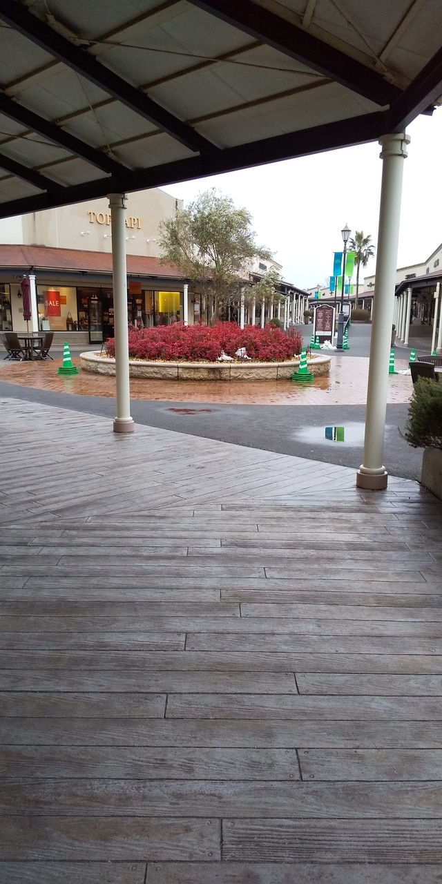 雨の平日、開店すぐに行ったこともあり車はまだ1桁の数でした。とってもゆっくり見てまわれました。道の左右に店がありますが、間に屋根はほとんどなく道を渡るときは濡れてしまいます。また階段には屋根があるけど、スロープには屋根がないのでここも渡ると濡れます。屋根が欲しいです。