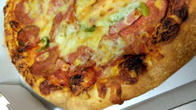 ハットの日のクーポンでデラックスピザを810円で購入!生地がふっくらモチモチで具も多め!美味しくてお得です。