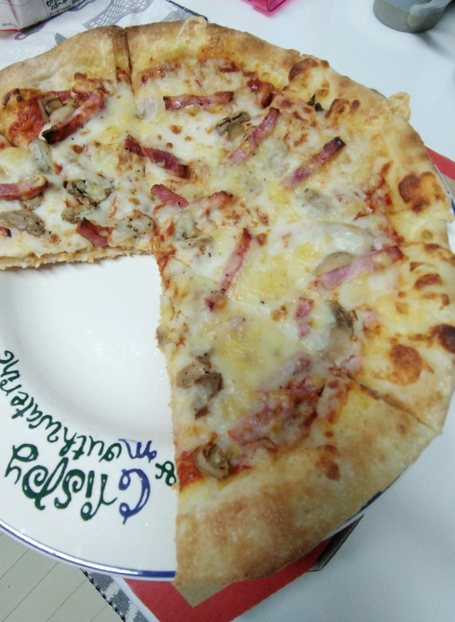 毎月のハットの日なので、アップルパイが食べたくて、ベーコンとマッシュルームのピザを注文しました、アンケートとクーポンがとてもお得です。