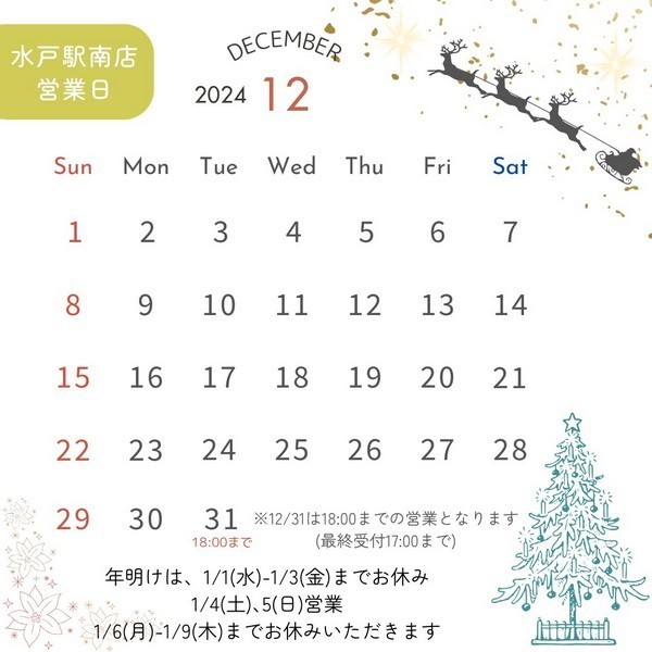 12/31(火)は18時まで(最終受付17時まで)の営業となります