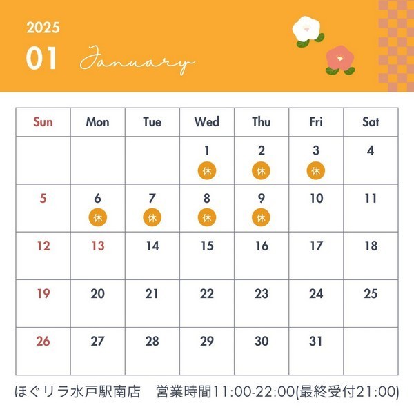 【1月定休日のご案内】
