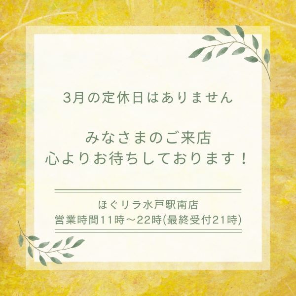 ほぐリラ水戸駅南店は、3月も定休日無く営業いたします!