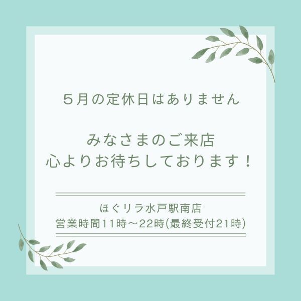 ほぐリラ水戸駅南店は、5月も定休日無く営業いたします!