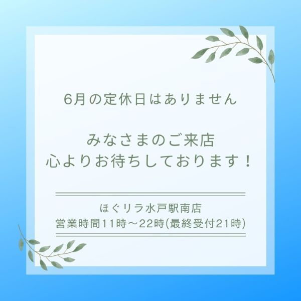 ほぐリラ水戸駅南店は、6月も定休日無く営業いたします!