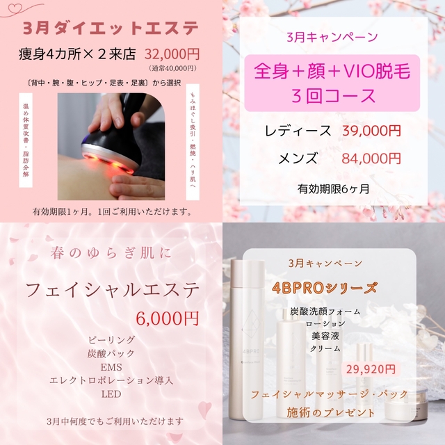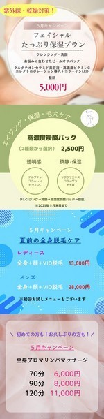 5月は脱毛・アロマリンパマッサージメニューのキャンペーンがございます♡