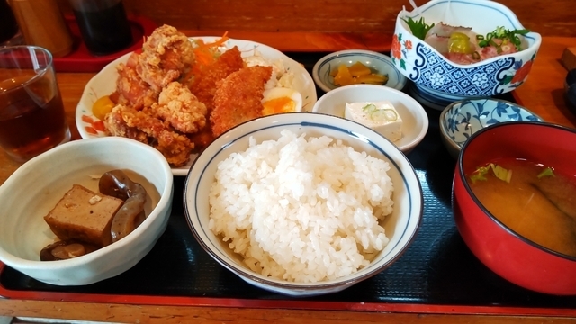 平日のお昼12時半過ぎに伺いました。 店内は、古き良き定食屋さんといった感じで、カウンター3席、テーブルが2席、座敷が数席、4組目の先客の方々がいらっしゃいました。 注文は、お得とウワサの本日の日替わり定食900円にしました。 から揚げ5個にイカフライ2個、ゆで卵半分とポテトサラダのメインに、鯛とブリとネギトロの刺身、煮物、冷奴、つけ物、これにご飯と味噌汁です。 量は、体育会の高校生や大学生でなければ十分で、品数が多く摂取品目が増えそうな感じが中年男子にはありがたいです。 から揚げは衣がカリカリしていて肉がやや固めでしっかり噛める「ご飯のおかずのから揚げ」な感じで、イカフライは柔らかく衣に味が付いていて、味が濃いわけではないのですが、ご飯がススム揚げ物衆でおいしいです。 刺身は外のメニューでは鯛とブリになってましが、ブリが一切れなせいか、ネギトロがついてました。こちらの刺身も臭みや乾いた感の無い、おいしい刺身です。冷奴は木綿、煮物は厚揚げ、しいたけ、こんにゃくで、定食としてのバランスが良く、店の雰囲気とも相まって、うまくまとまっています。 ほかのメニューも試してみたいのと、ご主人と奥さま(?)も感じが良く、気持ち良く食事できたので、これからも続いてほしいと思うお店です!