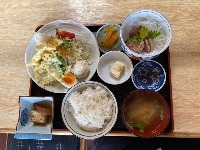 今回のオーダーも、本日の日替わり定食をいただきました。 メニューは、いわしのしそ揚げ&イカの天ぷら、刺身(ぶり、ネギトロ)、にものでした。 天ぷらはオーダーを受けてから揚げ始めるので、衣サクサクで美味しくいただけました。