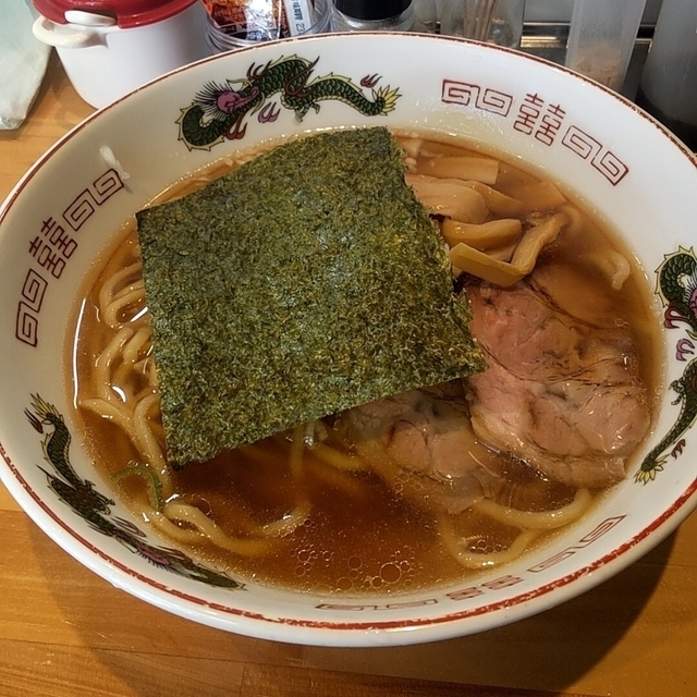 ●中華そば スープはベーシックな中華ベースだが、ネギなどが入りこくがあり、予想以上に美味しいスープ。 麺は中太のもちもち麺。トッピングにはチャーシュー、刻みネギ、大判のりなど。